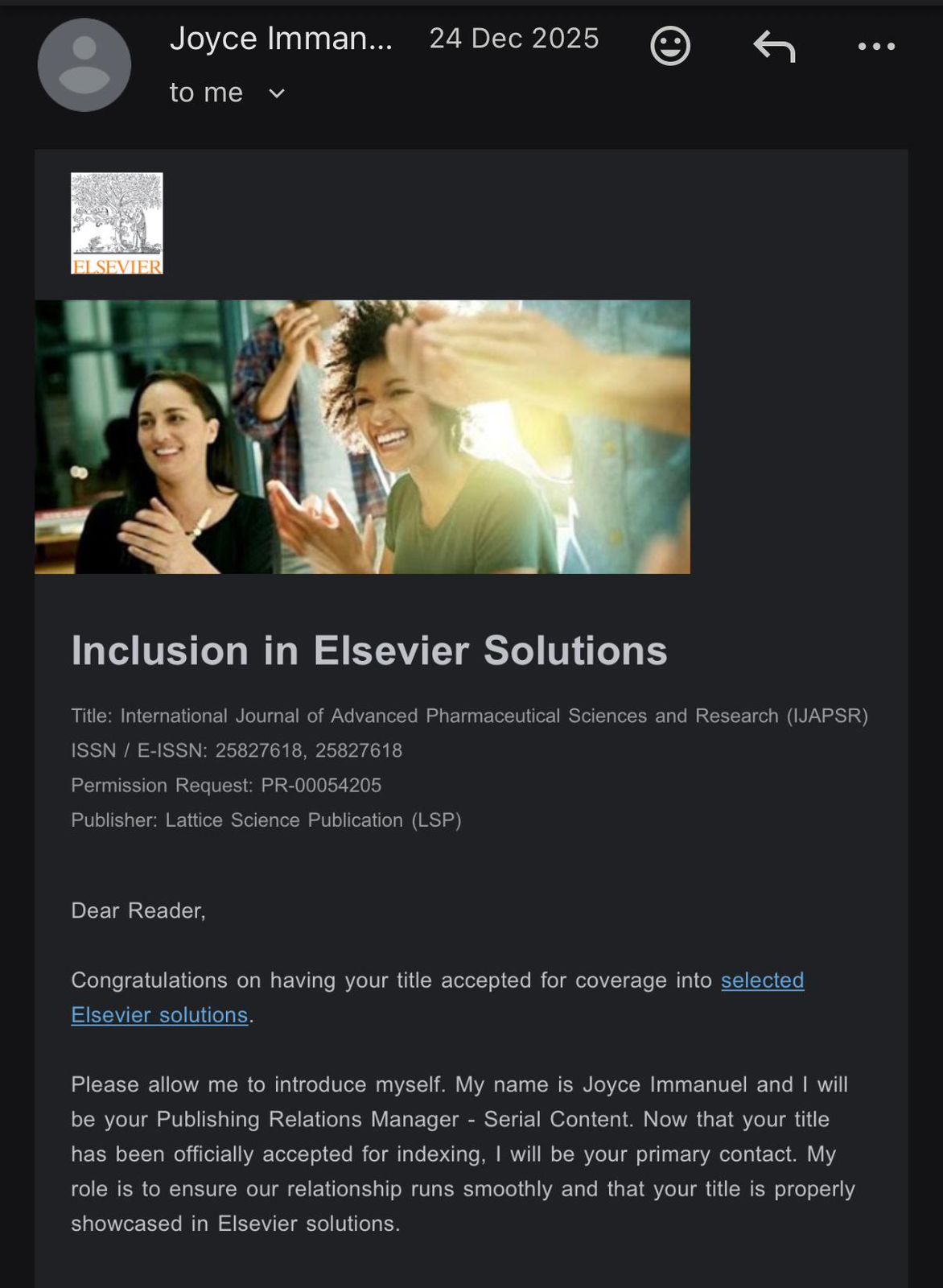 It is crucial to understand that the decision to add an article to an indexing and abstracting database, such as Scopus or Clarivate, is made solely by the team, not by the journal or publisher. Therefore, the International Journal of Advanced Pharmaceutical Sciences and Research (IJAPSR) has no authority over whether an article is accepted or rejected for inclusion in the database. Furthermore, the International Journal of Advanced Pharmaceutical Sciences and Research (IJAPSR) does not affect the required processing time for an article to be indexed and abstracted in the database. The indexing and abstracting details of the journal are given below: